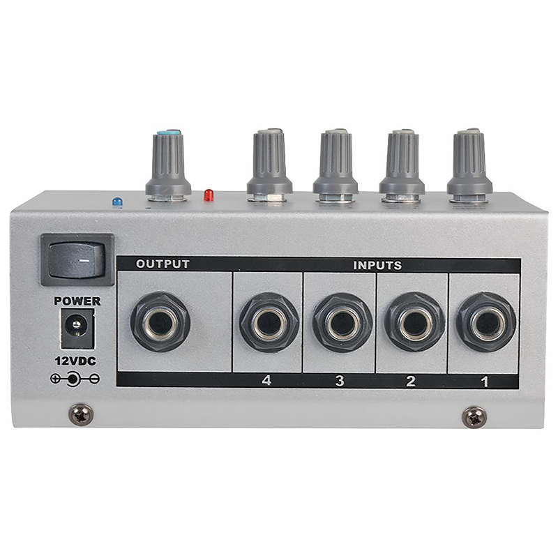 4 Channel mini microphone mixer allows you to add extra microphones to another mixer or active PA speaker.