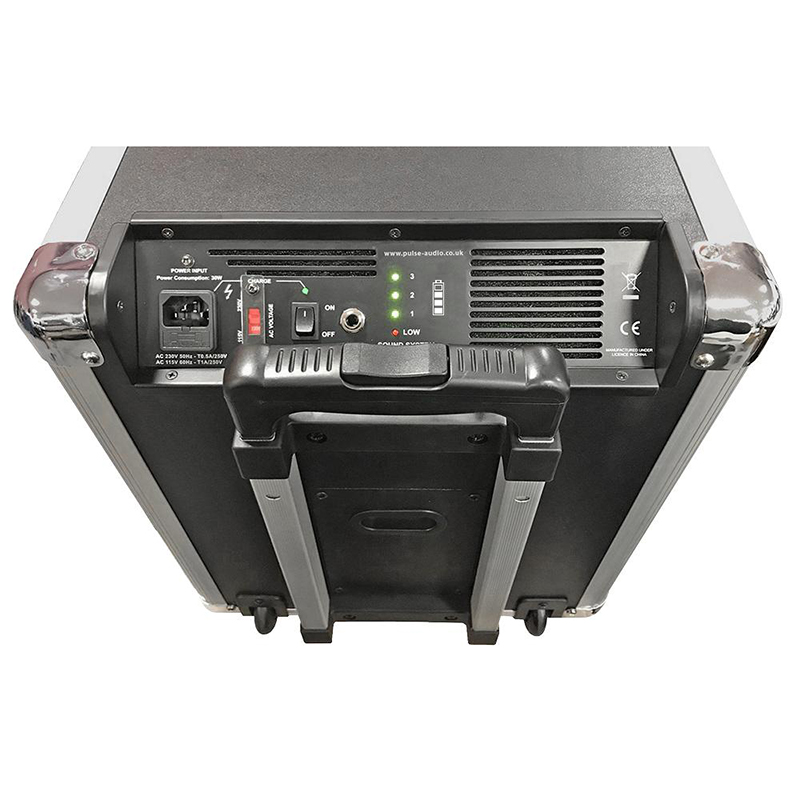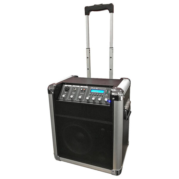 Complete portable PA system with built-in amplifier operating from mains or internal rechargeable battery powering a main driver and compression driver. The ultra portable TREKKER-8BT from PULSE is ideal for schools, parties and general music playback from a range of audio sources. It features the mixer/amp section at the rear along with integral USB/SD MP3 player, bluetooth connectivity and auxiliary line input. It has been design to meet specific needs of entertainers, presenters and performers, who demand a versatile portable PA for any location.
